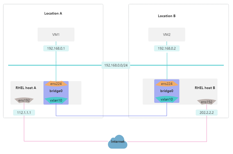 在两地分别部署一台RHEL8.10虚机,配置两张网卡,一张用于配置vxlan隧道与对方通信,一张用于与本地私网通信。如下图中:主机:RHEL HOST A/B ;网卡1:ens192,网卡2:ens224