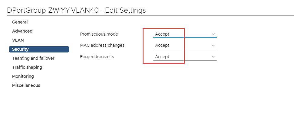 如果是VMware虚拟化,修改分布式交换机端口组配置,包括混杂模式和伪传输模式: